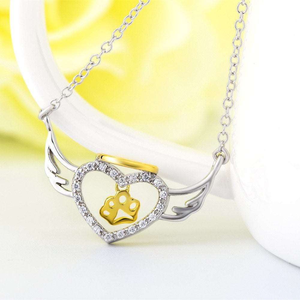 The design consists of angels wings surrounding the central heart piece, which itself contains a gold plated dog paw. There is also a gold plated halo on top of the heart to further enhance the message of the necklace.
